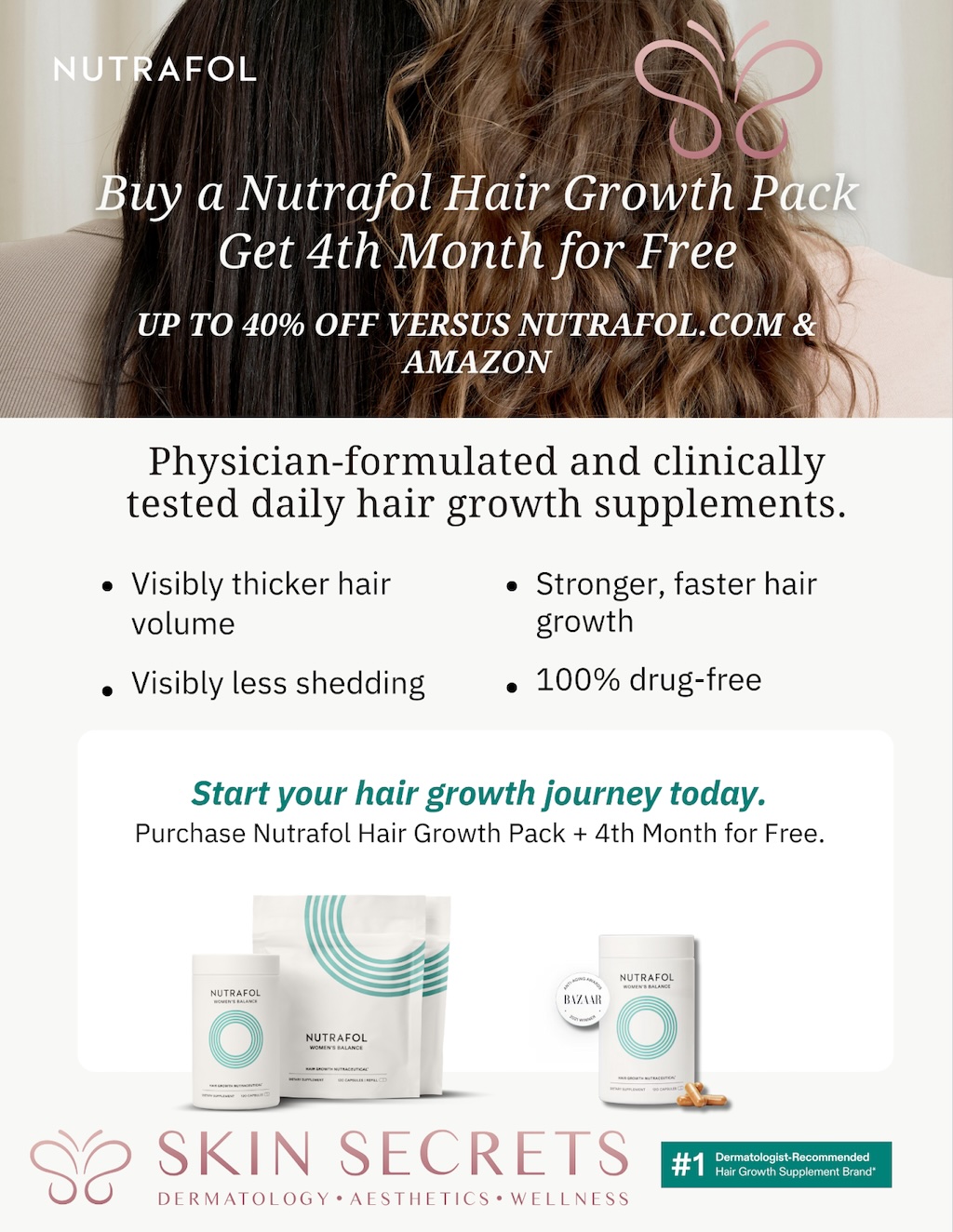 At Skin Secrets Dermatology, Aesthetics, and Wellness, we understand that healthy hair starts from within. When patients experience thinning, shedding, or changes in hair density, addressing the underlying causes is key. This month, we are highlighting Nutrafol, a clinically studied, physician formulated supplement designed to support hair growth by targeting factors such as stress, hormonal changes, and inflammation.